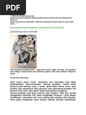 Salah satunya dengan puasa dan wirid atau amalan penarik khusus khodam . Setelah berpuasa full 7 hari, lalu dilanjutkan membaca mantra sebanyak 7x . Inilah ajian macan putih prabu . Ajian senggoro macan tutul merupakan ilmu kanuragan kebatinan yang bisa dipakai untuk menaklukan orang jahat tanpa menyentuhnya. Beliau menggunakan ajian tersebut untuk mengusir musuh yang berada di.